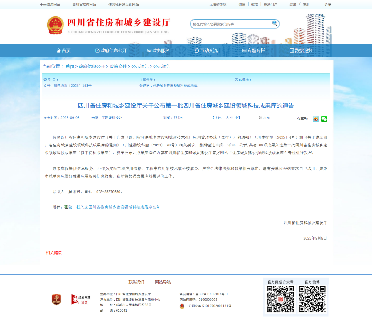 永沁環(huán)境一項(xiàng)成果入選住建廳第一批四川省住房城鄉(xiāng)建設(shè)領(lǐng)域科技成果庫