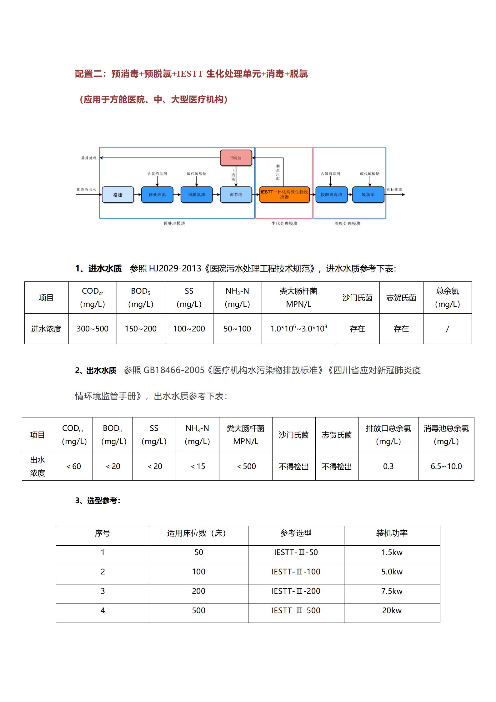配置二:預(yù)消毒+預(yù)脫氯+IESTT生化處理單元+消毒+脫氯(應(yīng)用于方艙醫(yī)院、中、大型醫(yī)療機(jī)構(gòu))