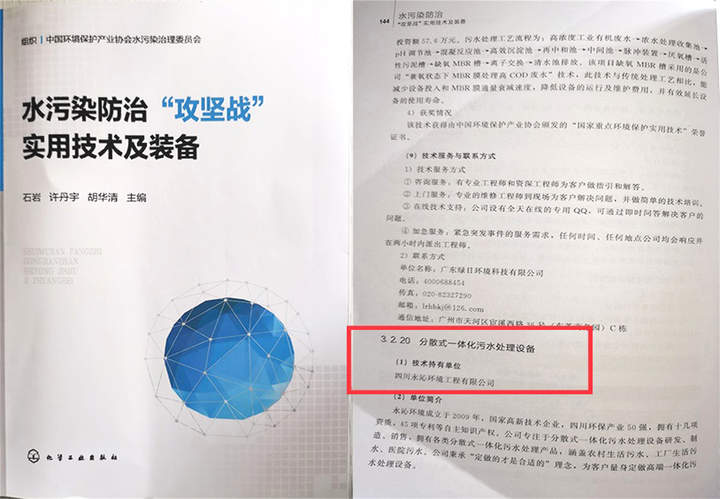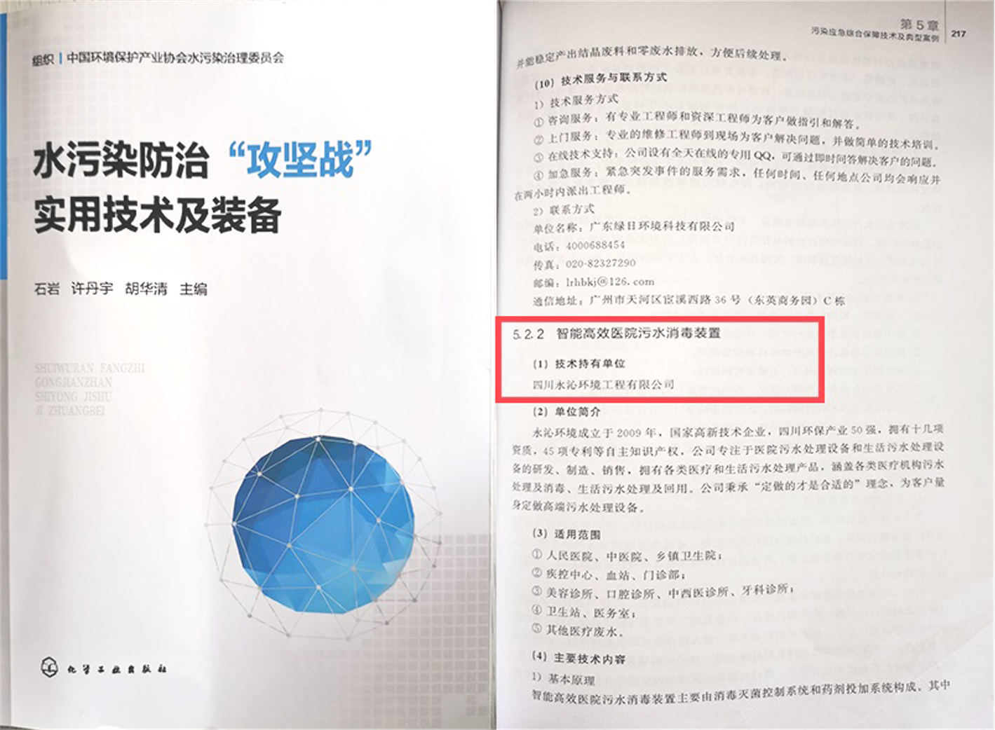 公司2項(xiàng)核心技術(shù)裝備,分散式一體化污水處理設(shè)備、智能高效醫(yī)院污水消毒裝置載入《水污染防治“攻堅(jiān)戰(zhàn)”實(shí)用技術(shù)及裝備》一書。