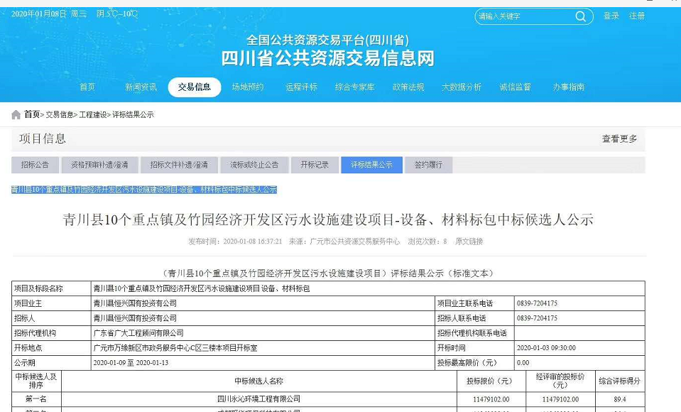 公司1100萬中標青川10個鄉(xiāng)鎮(zhèn)污水項目