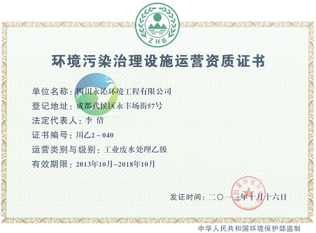公司獲得環(huán)保廳工業(yè)廢水生活污水運(yùn)營(yíng)乙級(jí)資質(zhì)