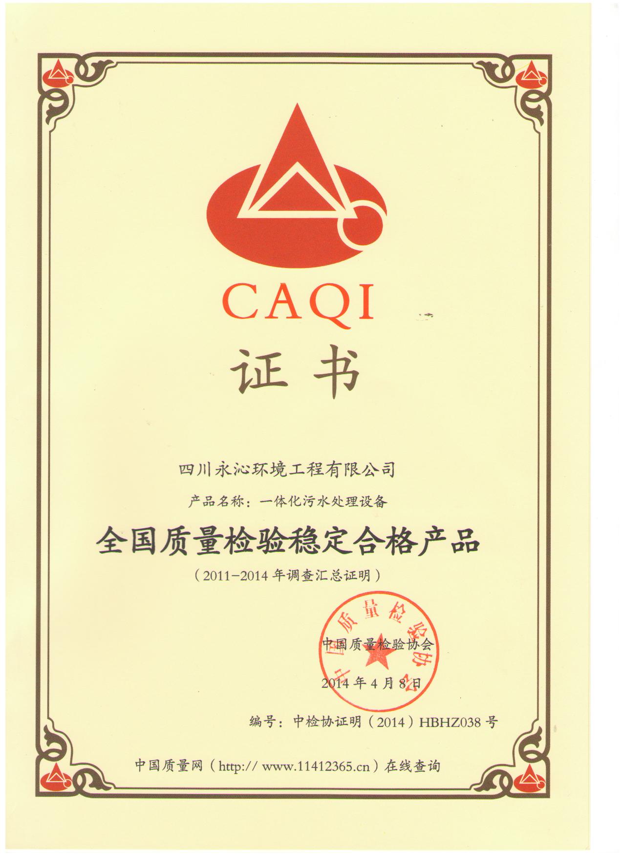 公司專利產(chǎn)品一體化污水處理設備,日前獲得國家質(zhì)檢總局直屬管理的中國質(zhì)量檢驗協(xié)會頒發(fā)“全國質(zhì)量檢驗穩(wěn)定合格產(chǎn)品證書”,此證是市場對我公司生產(chǎn)的一體化污水處理設備的又一個認可。