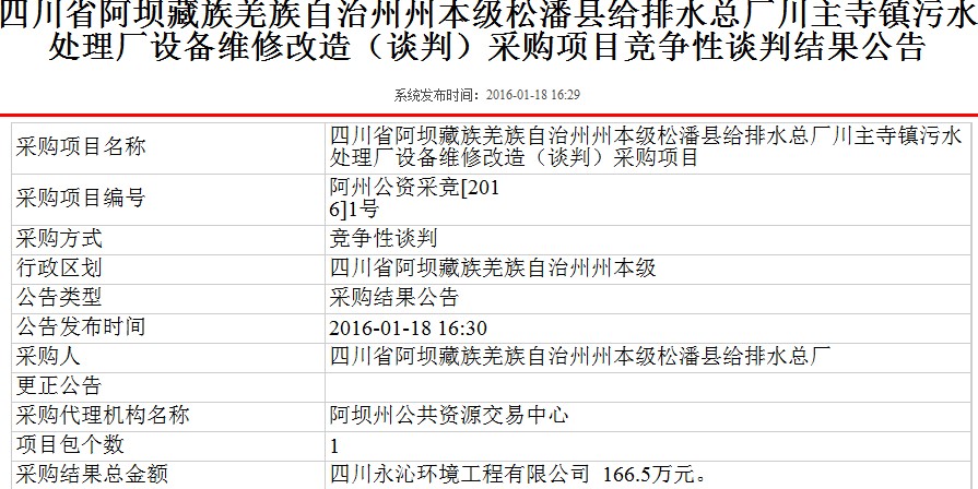 公司中標(biāo)阿壩州松潘縣給排水總廠川主寺鎮(zhèn)污水處理廠設(shè)備維修改造(談判)采購項(xiàng)目