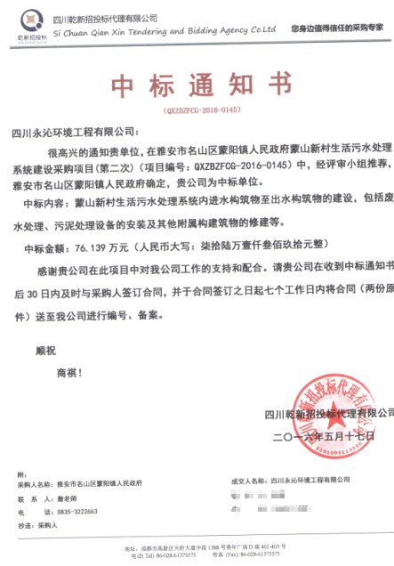 公司中標(biāo)雅安市名山區(qū)蒙陽(yáng)鎮(zhèn)人民政府蒙山新村生活污水處理系統(tǒng)建設(shè)采購(gòu)項(xiàng)目,項(xiàng)目采用綜合評(píng)分法,我公司憑借綜合實(shí)力成功從數(shù)十家公司中脫穎而出。