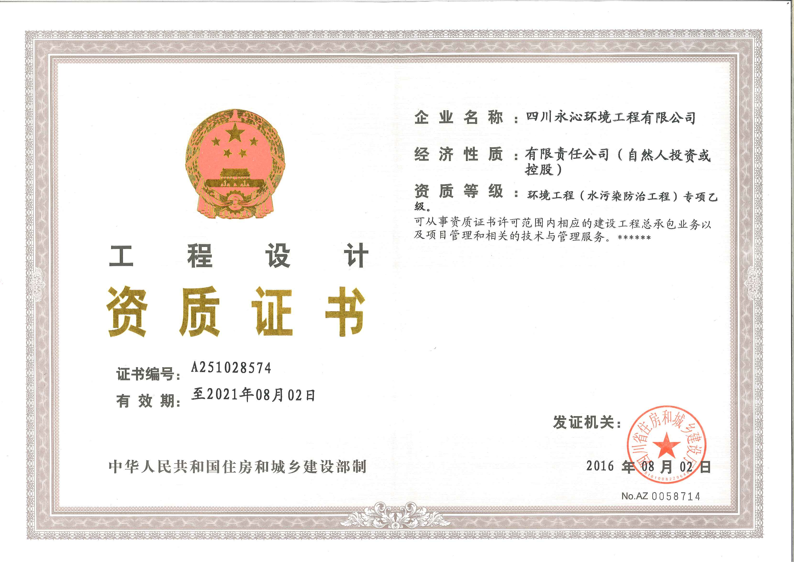 日前,公司獲得四川省住房和城鄉(xiāng)建設(shè)廳頒發(fā)的工程設(shè)計(jì)資質(zhì)證書,資質(zhì)等級(jí):環(huán)境工程(水污染防治)專項(xiàng)乙級(jí)。此資質(zhì)對(duì)公司產(chǎn)業(yè)鏈的完善,業(yè)務(wù)延伸具有極大的戰(zhàn)略意義。今后,公司能夠在項(xiàng)目前期為業(yè)主提供更周到、專業(yè)的技術(shù)服務(wù)支持,公司的核心技術(shù)也能在施工圖中體現(xiàn)的更加淋漓精致。