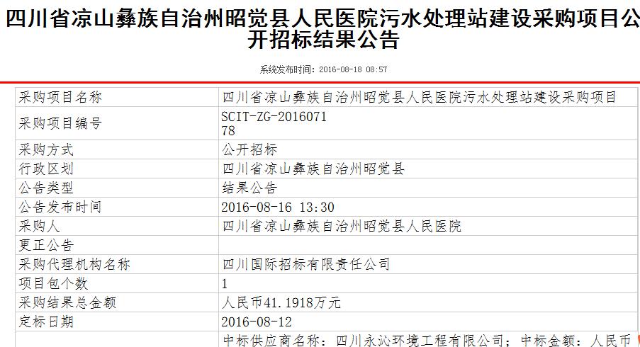 日前,我公司于2016年8月16日順利中標(biāo)—四川省涼山彝族自治州昭覺縣人民醫(yī)院污水處理站建設(shè)采購項(xiàng)目,中標(biāo)金額為41.1918萬元。該項(xiàng)目是我公司專業(yè)領(lǐng)域—醫(yī)院污水處理上的又一重大收獲。