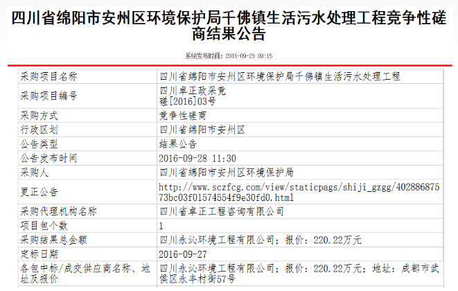 公司中標(biāo)綿陽市安州區(qū)千佛鎮(zhèn)生活污水處理工程