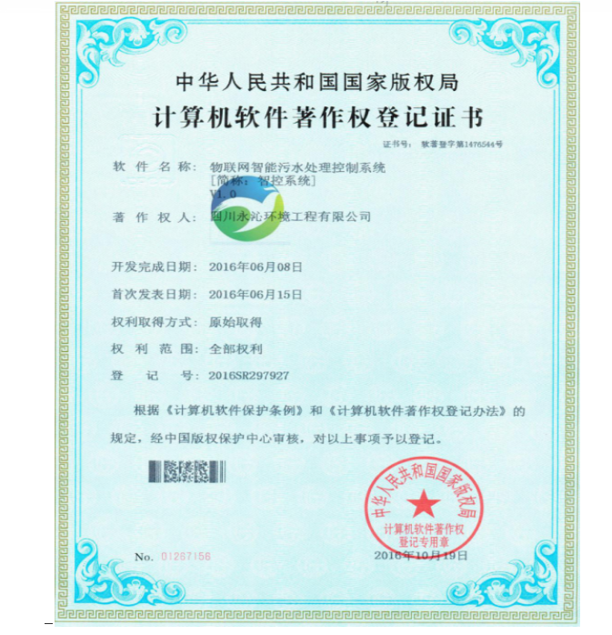 2016年10月19日,公司再一次喜獲計(jì)算機(jī)軟件著作權(quán)登記證書——物聯(lián)網(wǎng)智能污水處理控制系統(tǒng)[簡稱:智控系統(tǒng)]V1.0,登記號:2016SR297927。
