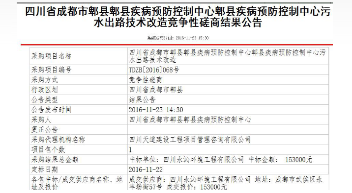 公司中標成都市郫縣疾病預(yù)防控制中心污水出路技術(shù)改造