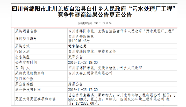 2016年11月28日,我公司成功中標——四川省綿陽市北川羌族自治縣白什鄉(xiāng)人民政府“污水處理廠工程”。該項目中標金額:1572888.00元,該工程內(nèi)容為:為業(yè)主提供醫(yī)院污水處理設(shè)施——生物轉(zhuǎn)盤。該設(shè)備是我公司22項專利設(shè)備之一的特色設(shè)備,在鄉(xiāng)鎮(zhèn)污水處理中運用尤其廣泛,設(shè)備專利號為:ZL 2015 2 0327134.4。