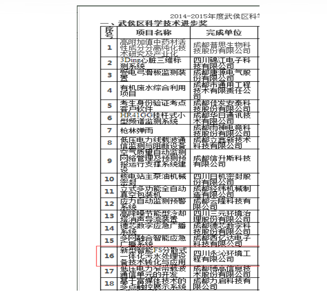 日前,公司榮獲武侯區(qū)科學(xué)技術(shù)進(jìn)步獎(jiǎng),獲獎(jiǎng)項(xiàng)目名稱:新型智能FS分散式一體化污水處理設(shè)備技術(shù)轉(zhuǎn)化與應(yīng)用。