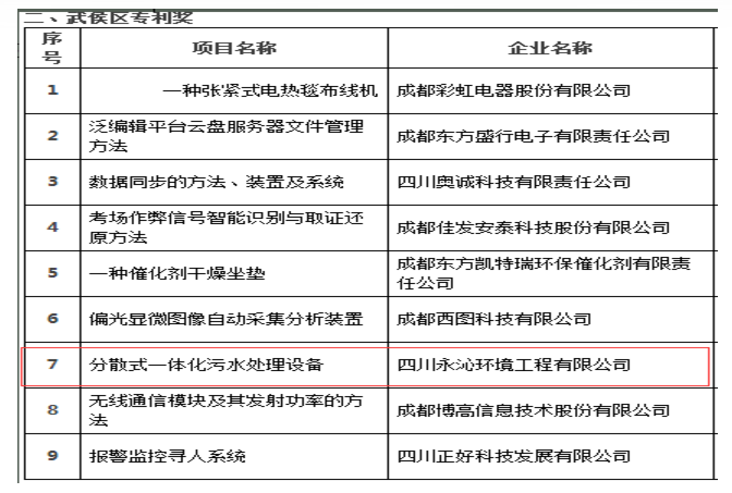 日前,公司喜獲武侯區(qū)專利獎,獲獎項(xiàng)目名稱:分散式一體化污水處理設(shè)備。