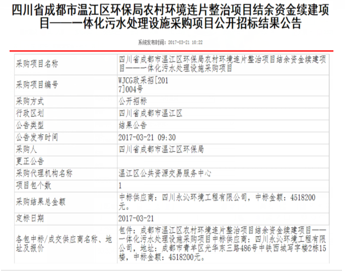 2017年3月21日,我公司成功中標——四川省成都市溫江區(qū)環(huán)保局農(nóng)村環(huán)境連片整治項目結(jié)余資金續(xù)建項目—一體化污水處理設施采購項目。該項目中標金額:4518200元,工程內(nèi)容:為業(yè)主提供11套一體化污水處理設備及其配套設施的設計、安裝、調(diào)試和售后服務。