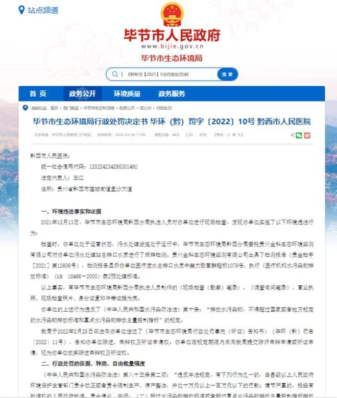 2022年3月15日,畢節(jié)市生態(tài)環(huán)境局對(duì)黔西市人民醫(yī)院作出處罰30萬(wàn)元的決定(近日,華商報(bào)大風(fēng)新聞?dòng)浾邚漠吂?jié)市生態(tài)環(huán)境局官網(wǎng)證實(shí),相關(guān)處罰在該網(wǎng)確有記錄)。
