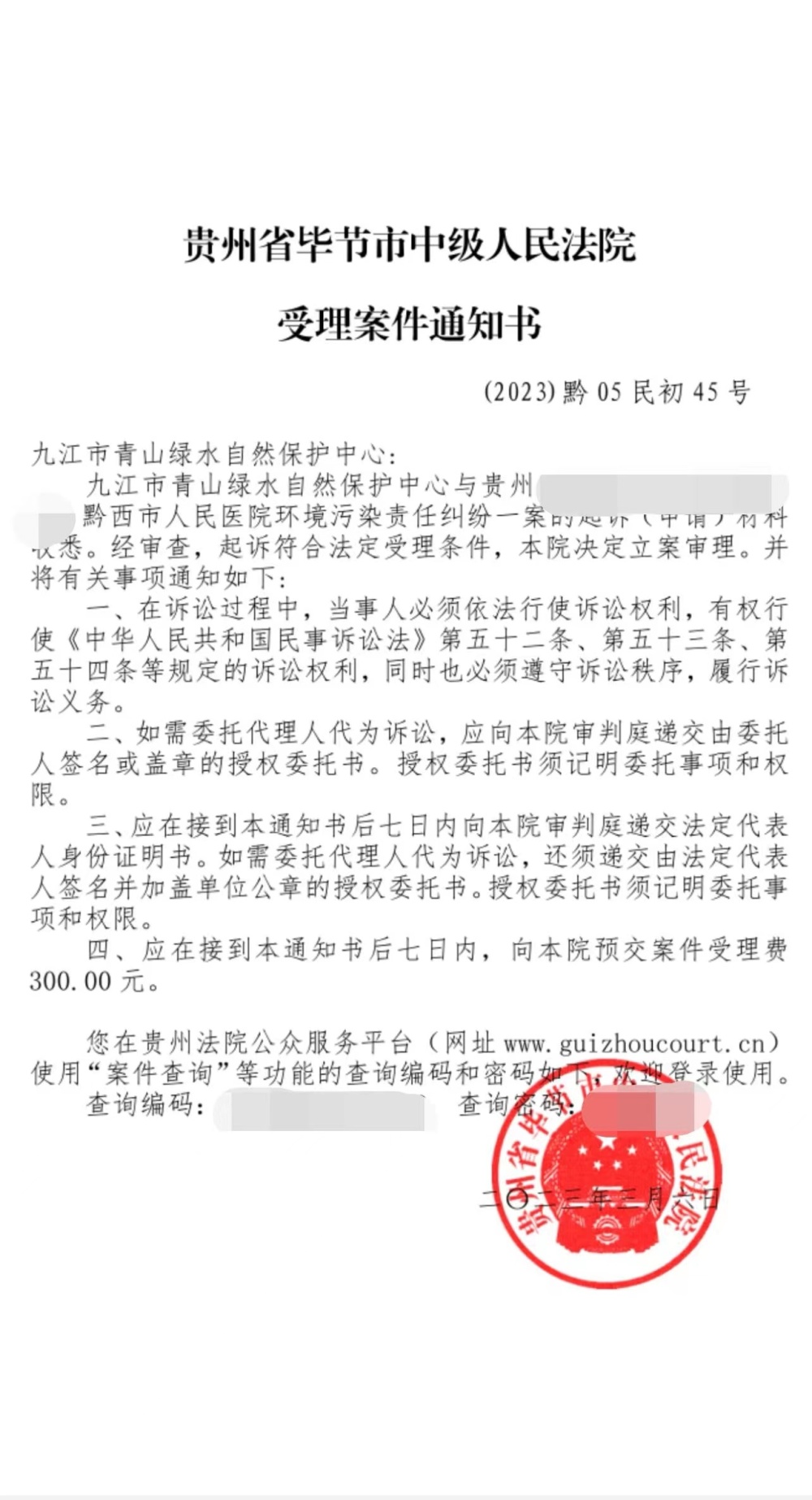 近日,華商報(bào)大風(fēng)新聞?dòng)浾邚木沤星嗌骄G水自然保護(hù)中心獲悉,該中心訴黔西市人民醫(yī)院環(huán)境污染責(zé)任糾紛一案,畢節(jié)市中院已立案,目前正等法院開(kāi)庭審理。