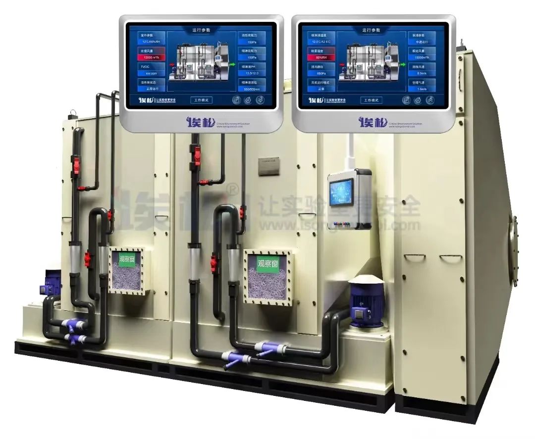 充分考慮實驗室采用變風量排風系統(tǒng)的特點,采用變頻泵浦設計,根據(jù)排風風量,噴淋水泵智能變頻控制,節(jié)能減排;