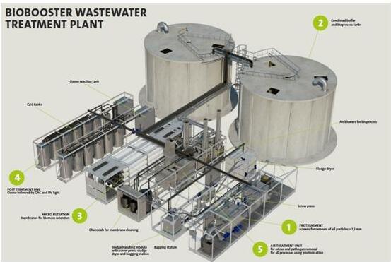 格蘭富公司作為項目所有人,提供技術(shù)支持。處理廠的設(shè)計是基于膜生物反應(yīng)系統(tǒng)(MBRsystem,Membrane Biological Reactor),由生物處理成和旋轉(zhuǎn)陶瓷超濾膜組成。